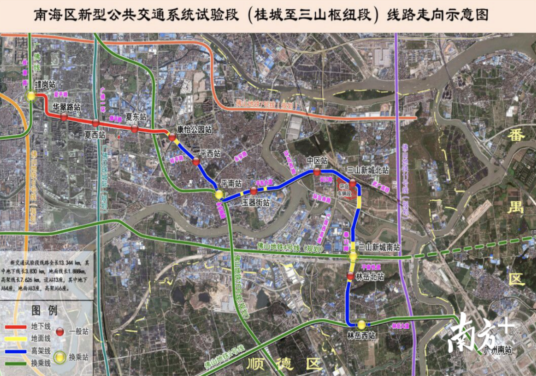 按照现有规划,南海新交通一共设有(虫雷)岗公园、华翠路、夏西、夏东、康怡公园、平西、平南、平洲玉器街、中区、三山新城南、三山新城北、林岳西等13个站点。其中,(虫雷)岗公园站可换乘广佛线,林岳西站可换乘佛山2号线,这不仅让南海中心城区的千灯湖片区、映月湖片区和三龙湾南海片区连为一体,还将进一步广佛两地的轨道交通联系。