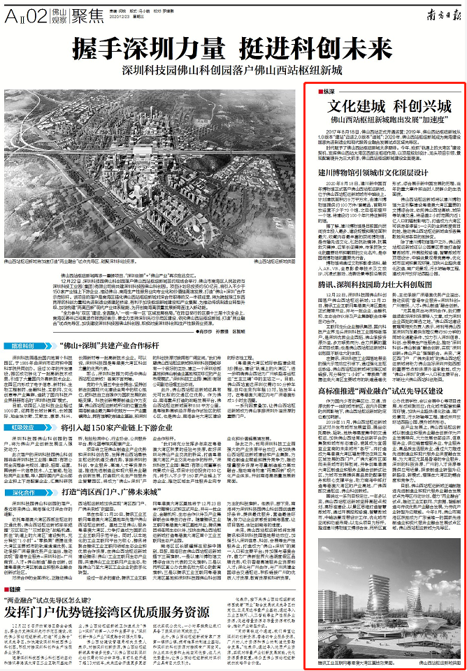 12月22日,深圳科技园佛山科创园落户佛山西站枢纽新城;12月23日,腾讯工业互联网粤港澳大湾区基地正式揭牌开业,并与一批企业、金融机构、生态合作伙伴及产业集群联合体等签约合作。
