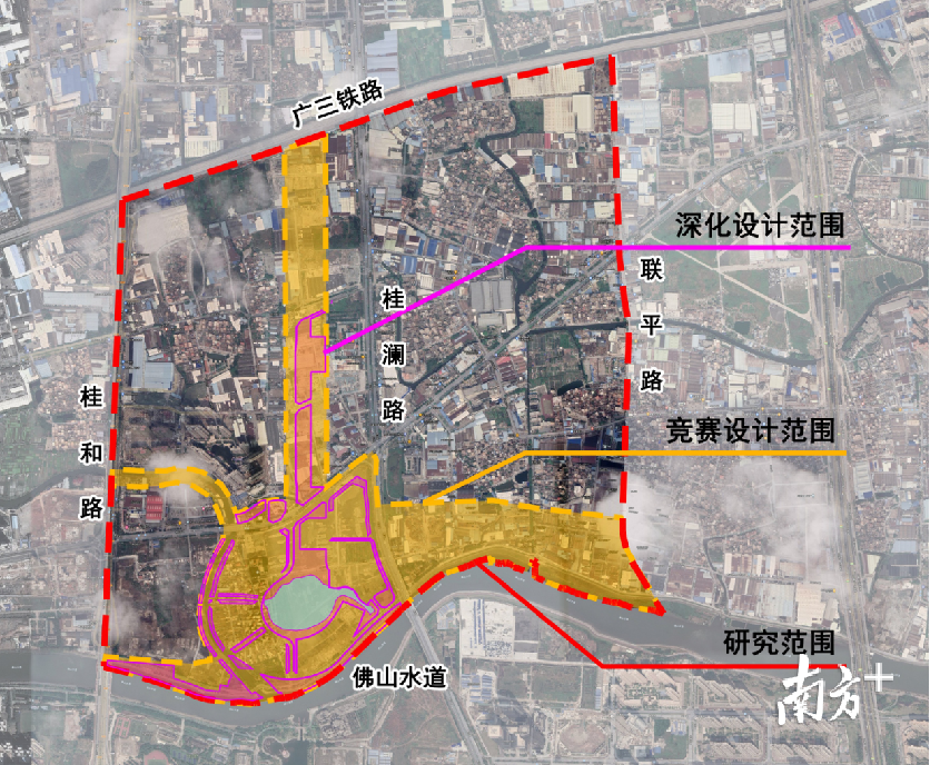 南海艺术中心片区范围由穗盐西路、佛山水道、桂和路及桂澜路围合而成,总占地面积约1046.4亩,是“千灯湖中轴线北延、城市中心北延提质发展、文化体育过河”的重要节点项目,是南海“东拓进湾、北延过河”的关键一步,也是南海站在新时代新起推动高质量发展的一个里程碑。