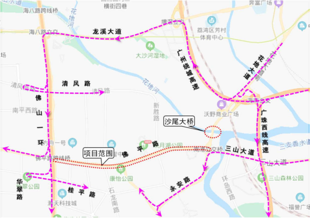 ⑦佛平路北侧地区→清风路→广佛江珠高速(原佛山一环)→龙溪大道→广州绕城高速→花地大道。