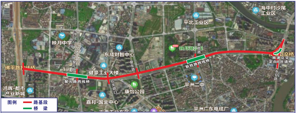 本阶段拟修筑并拓宽佛平路现状辅道,按双向六车道建设。施工期间,主路维持双向六车道通行,慢行系统利用现状,工期为7个月。