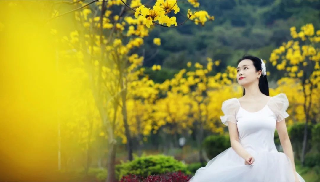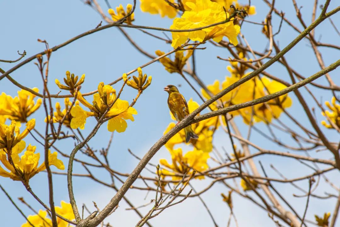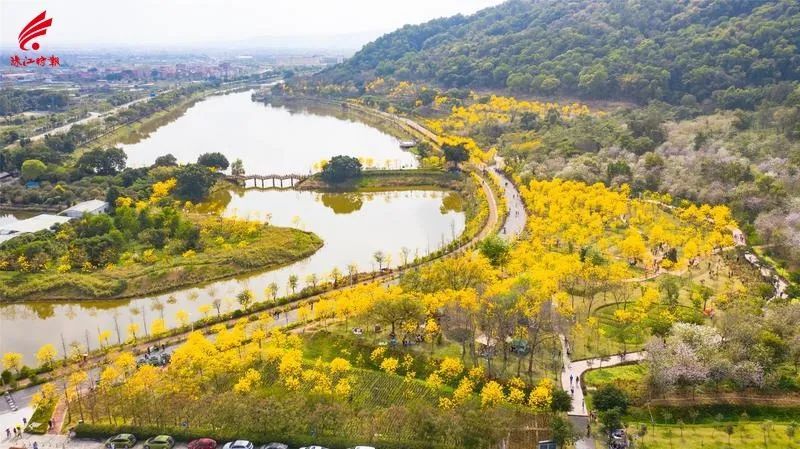 环山花海,一片金黄,漫山黄花风铃木开花,踏春时注意做好防护,减少聚集。