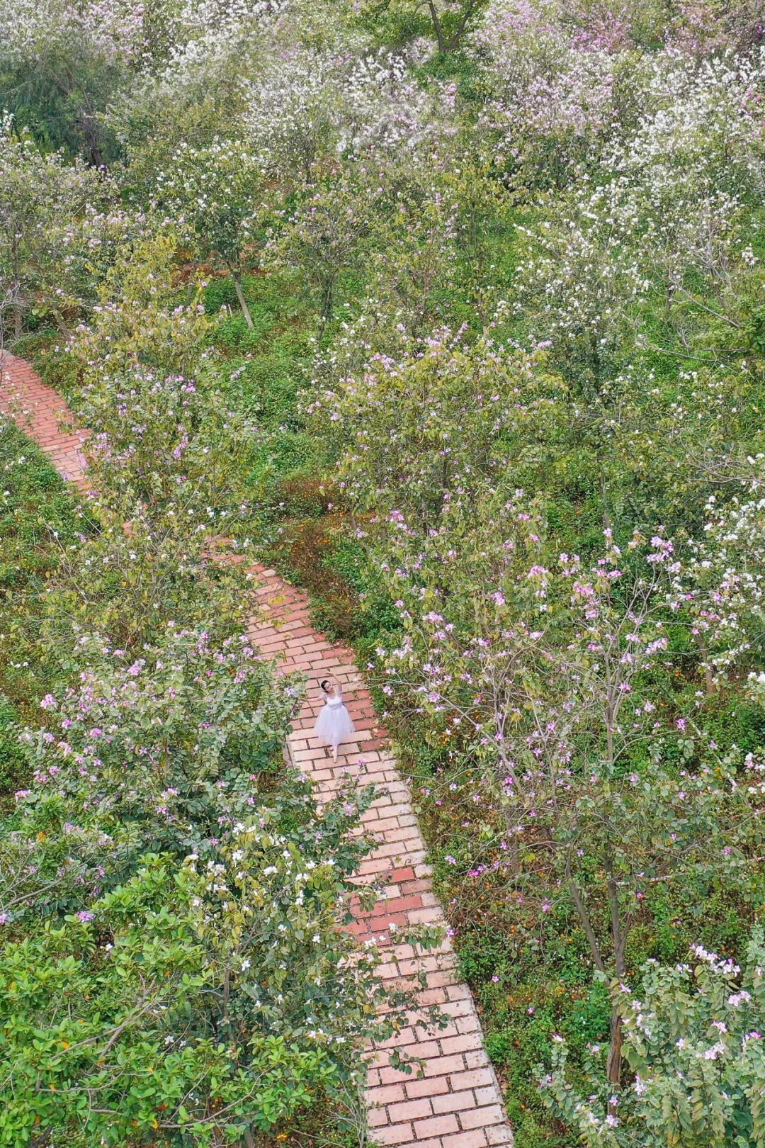 环山花海,宫粉羊蹄甲遍山开放。