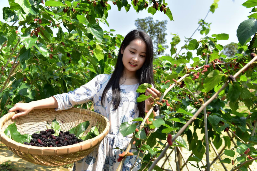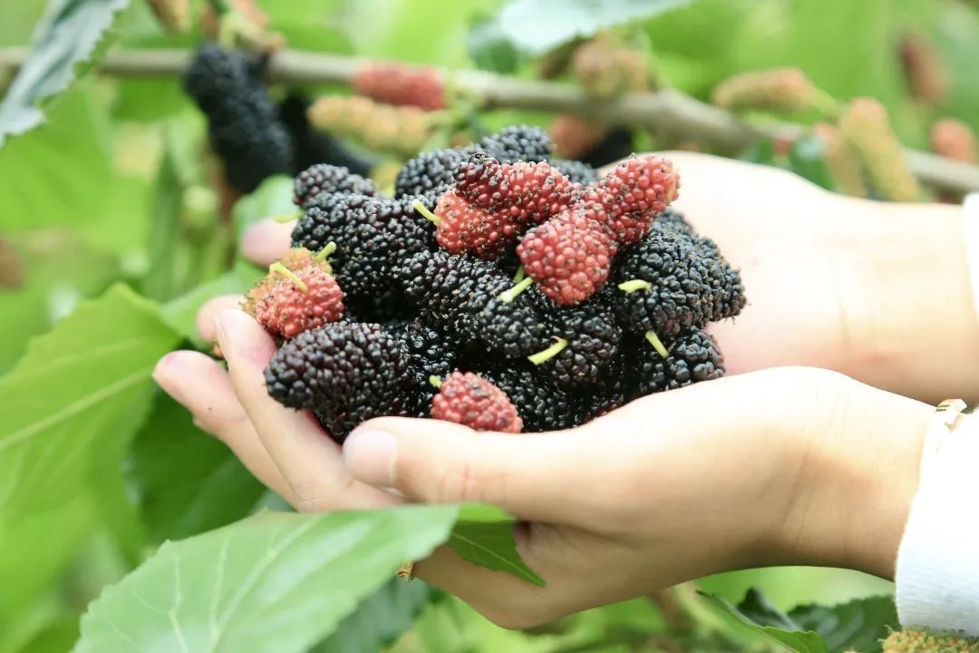 20000多棵桑树成熟,果子红得发紫、甜得如蜜。
