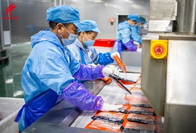 何氏水产员工在流水线上忙碌作业。