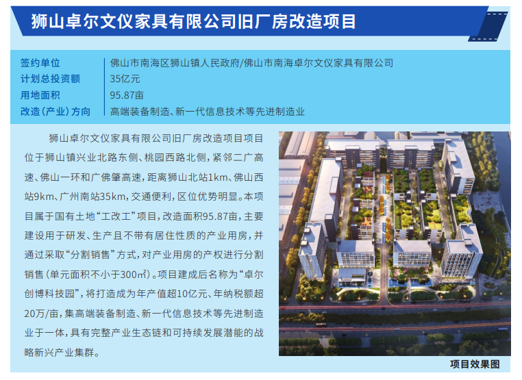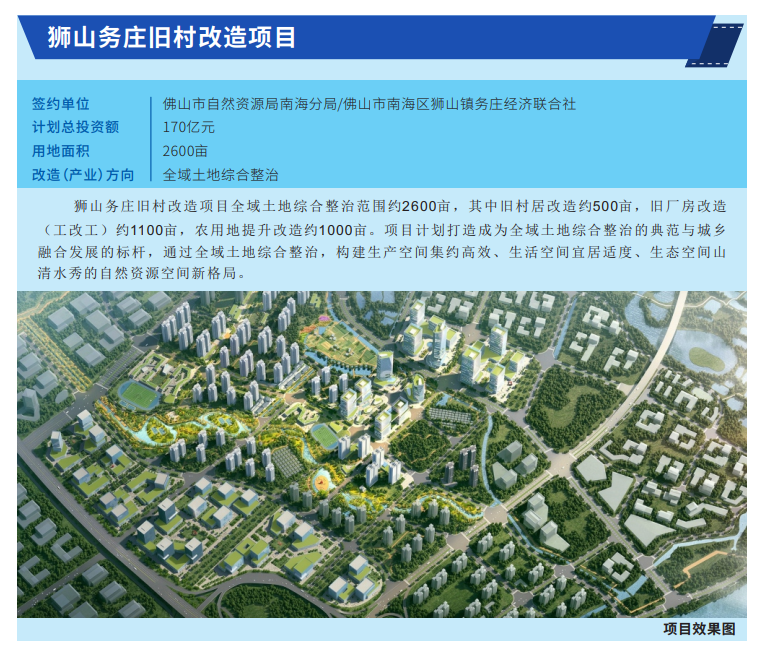 今年3月,南海区印发《关于规范和加快“三旧”改造工作促进城乡融合发展改革创新实验区建设工作方案》,启动南海区旧村居改造三年计划。活动现场,对纳入三年行动计划的旧村改造项目代表项目、产业类项目进行签约。签约项目共18个,其中狮山镇2个,面积约2695.87亩,计划总投资额约205亿元。
