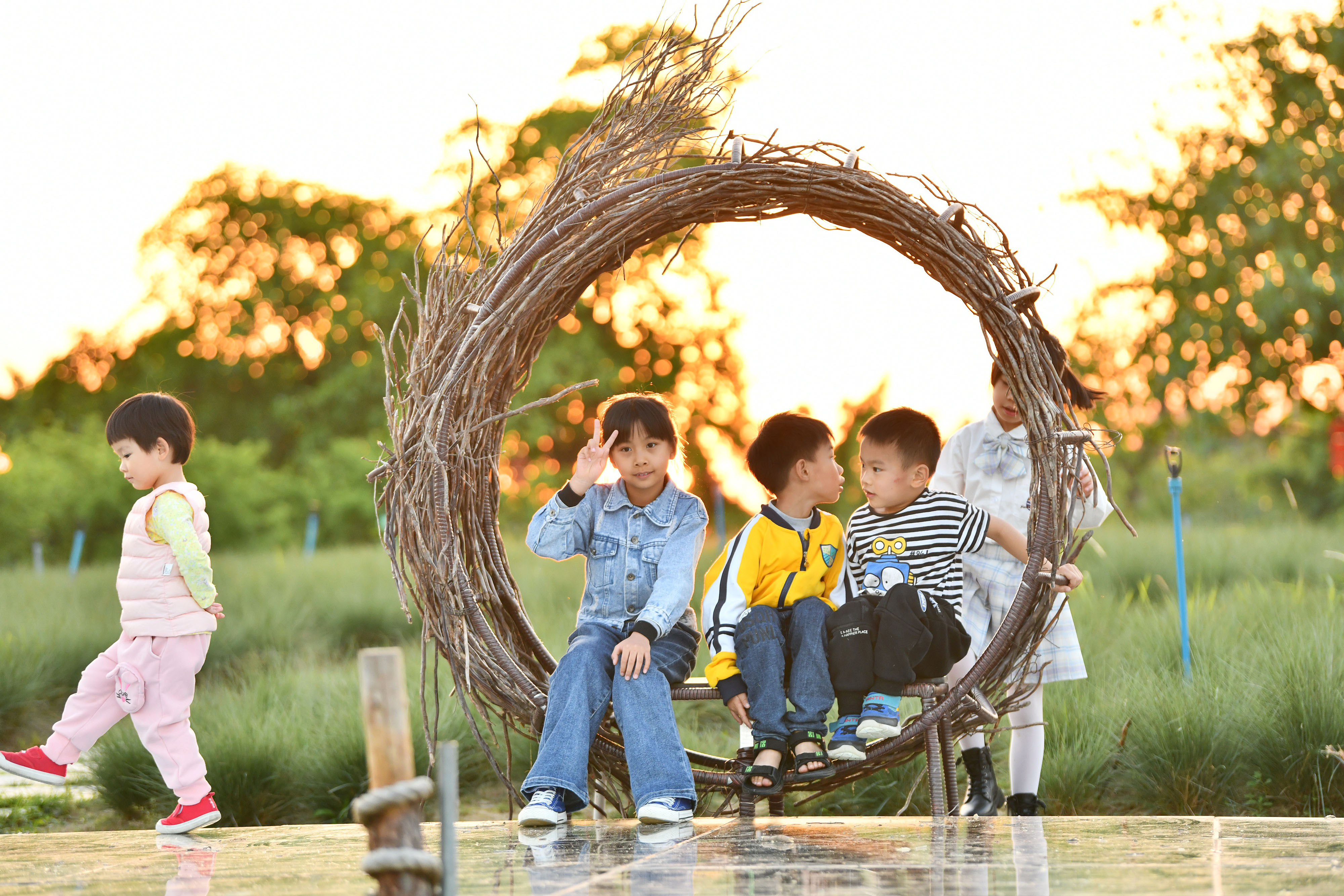 丹灶翰林湖公园内,小朋友结伴玩耍。