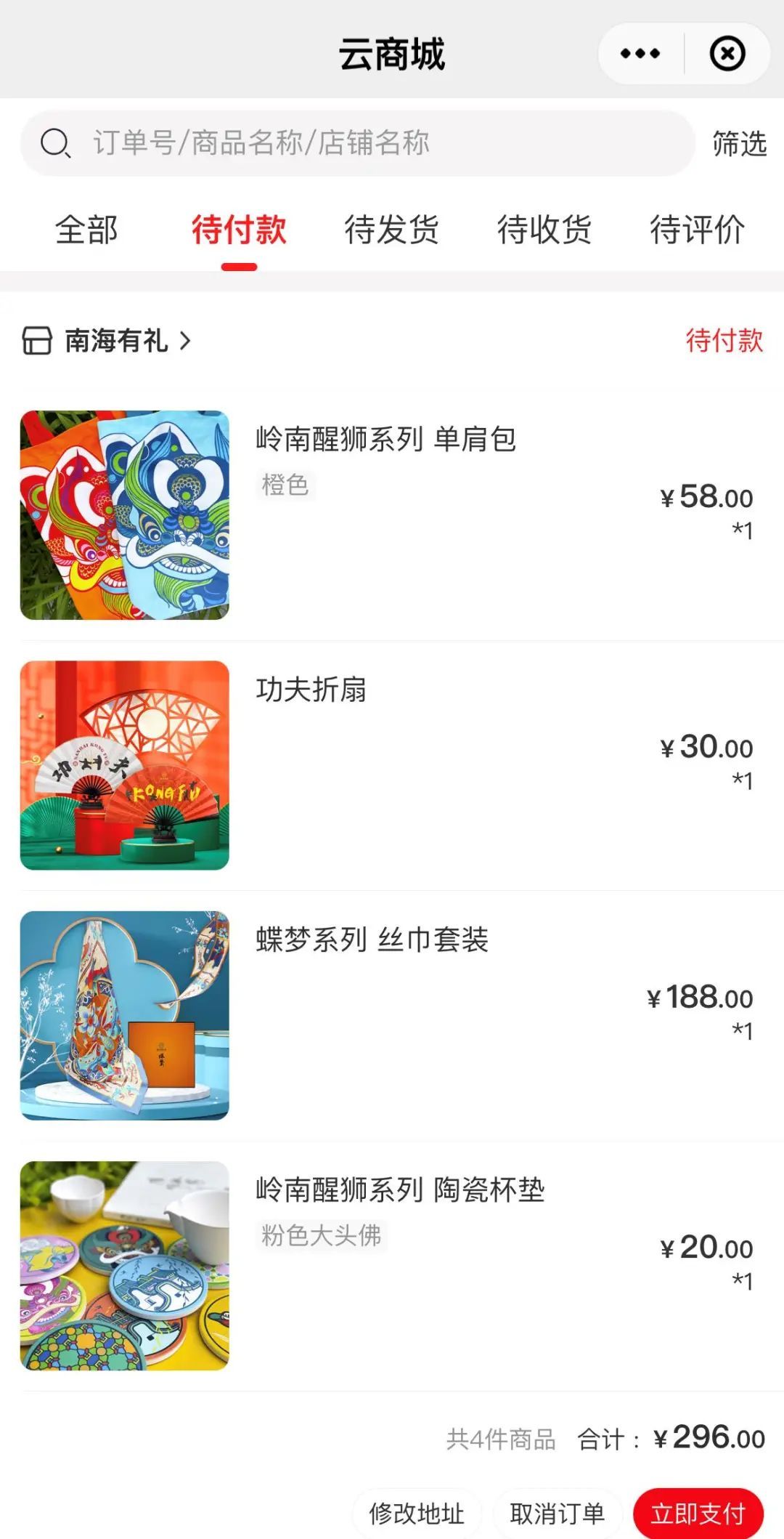 “南海有礼”系列文创:岭南醒狮系列、南海珍宝系列、古韵风情系列、人文龙功夫狮系列……各种创意好物如行李牌、冰箱贴、双肩包、杯垫、T恤等,均可在“线上商城”下单,一键加购,送货到家!