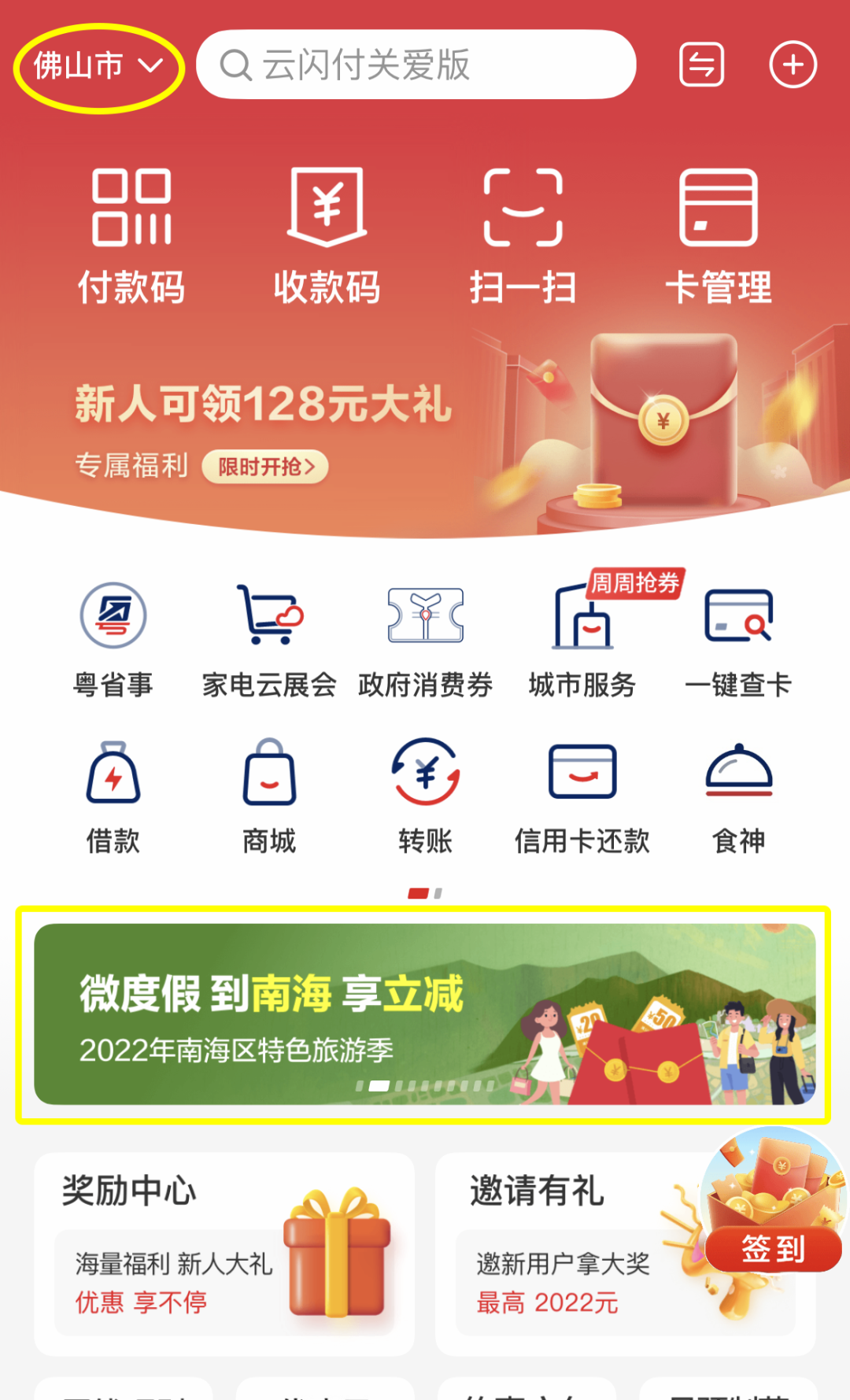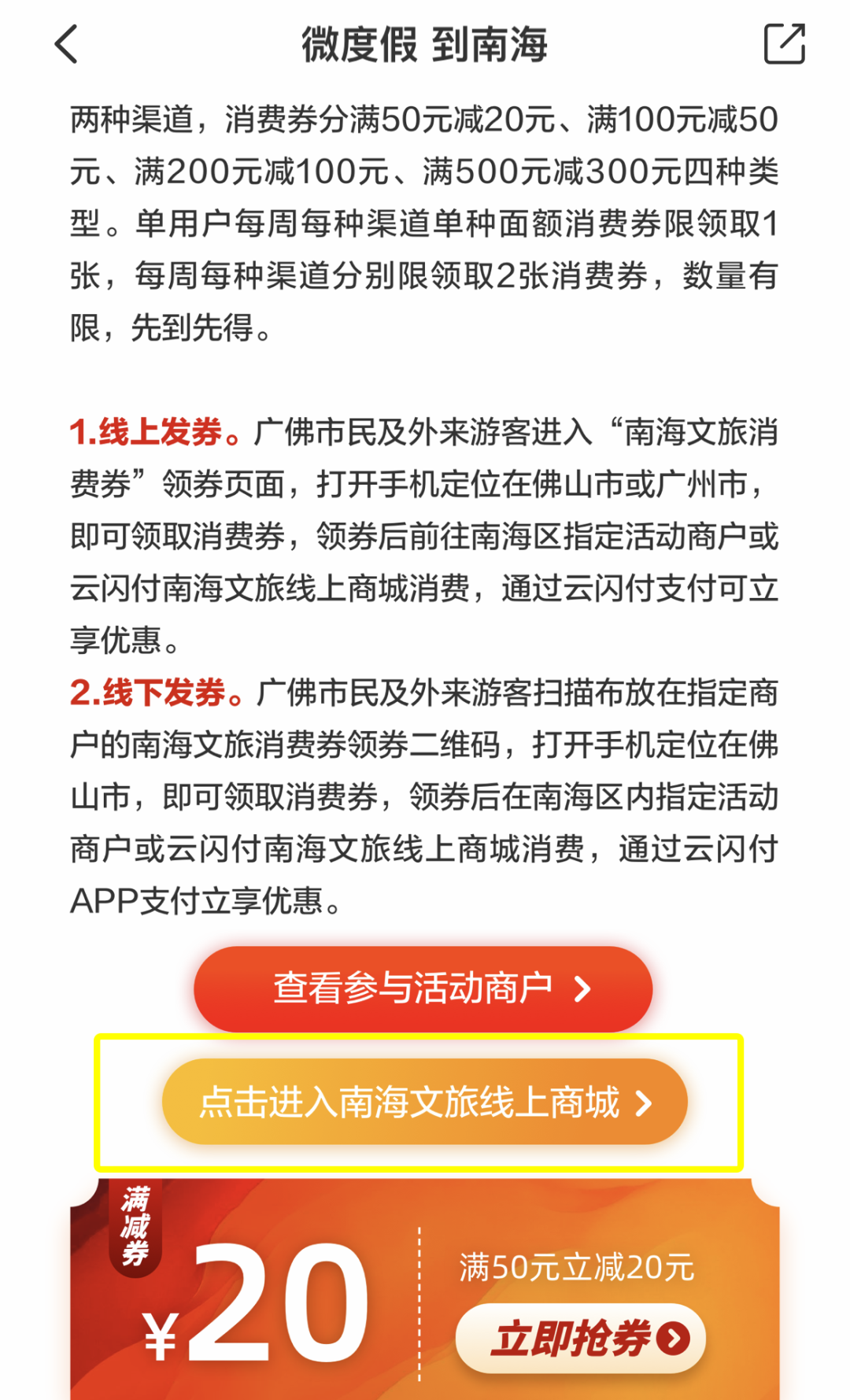 首页“南海微度假”轮播图进入消费券领券页面,点击”线上商城”入口进入。