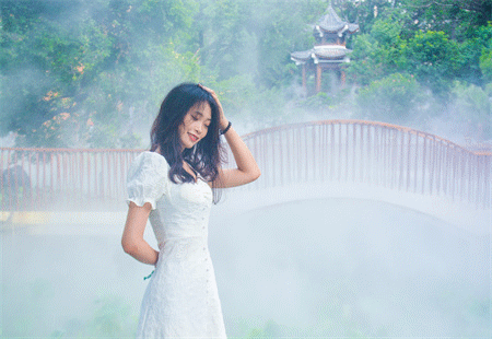 漫步在小桥上,烟雾缓缓从荷塘升起,景色隐于雾中若隐若现,时而是荷塘碧色,时而是美人入画。