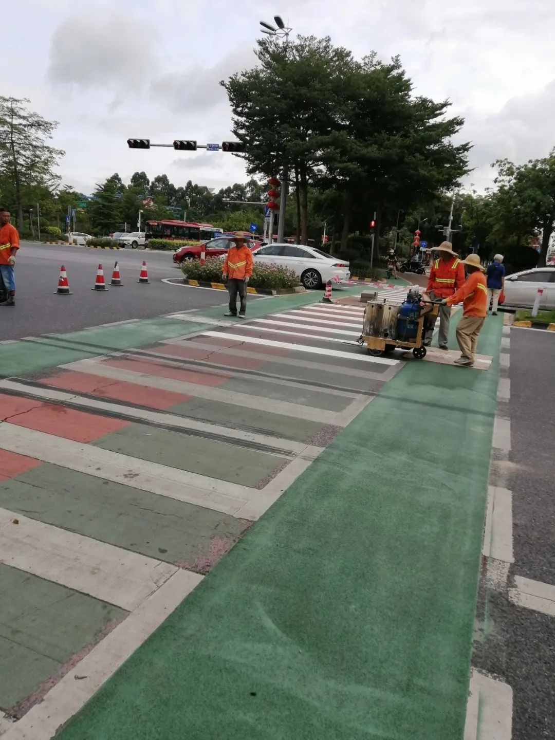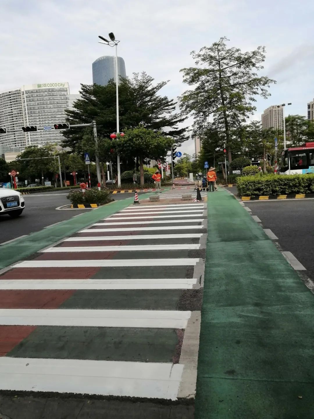 狮山城区石门实验中学门口红星北路段,自行车及电动自行车专用道整体面貌焕然一新,路面统一涂装成墨绿色,非隔离栏杆