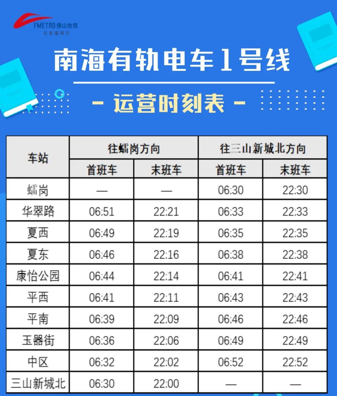 南海有轨电车 1 号线自 2022 年 10 月 1 日起恢复正常运营时间,即三山新城北站末班车时间为 22:00,𧒽岗站末班车时间为 22:30。