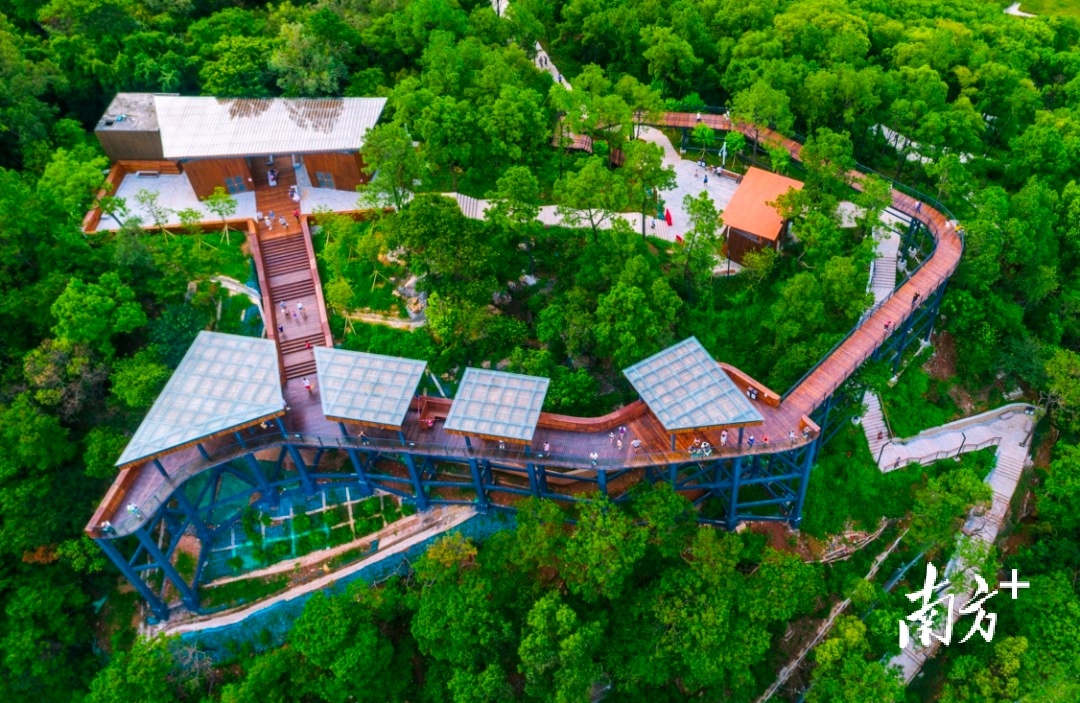 在这里,不仅有沿山而建蜿蜒曲折的空中栈道,也有特设的迷你儿童游玩区,涵盖攀爬网、小山坡攀岩、滑梯等儿童喜爱的设施;登上公园最顶端的观景平台,还可俯瞰整个文翰湖片区,眺望高铁穿梭往来;走进建在山顶的智慧图书馆——三鸣台,还能在满山苍翠中悠享书香时光……在城央能看到如此立体丰富的森林景观,游玩综合体验感强,放眼湾区,甚为少见。