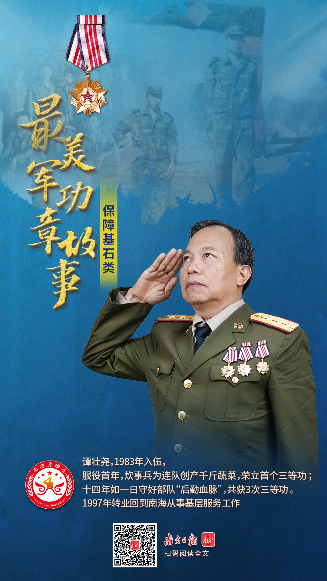 和很多人想象中激情燃烧的军旅生涯不同,后勤保障贯穿于谭壮尧的整个军旅生涯。服役首年,他作为炊事兵为连队创产千斤蔬菜,荣立首个三等功;他十四年如一日守好部队“后勤血脉”,多次在不同的后勤保障岗位作出特别贡献,在平凡工作中发热发亮,共获3次三等功。