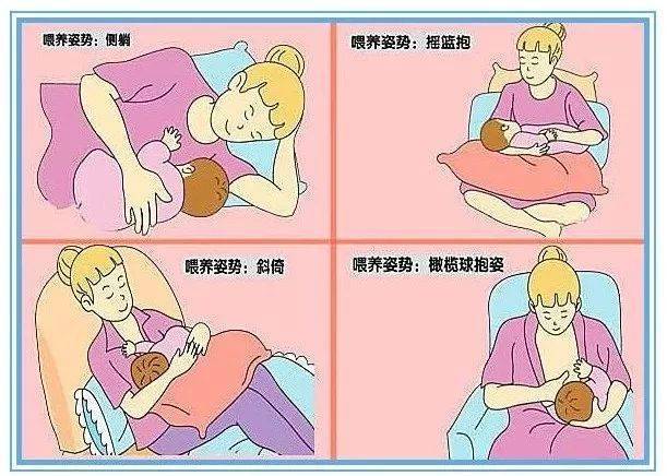 喂养姿势是否得当,对于母乳喂养的效果至关重要。可采用“摇篮式”的姿势进行喂养,在有扶手的椅子上坐直,将孩子抱在怀里,用前臂和手掌托着孩子的身体和头部。除此之外,还有橄榄球式,交叉摇篮式,侧卧式等。