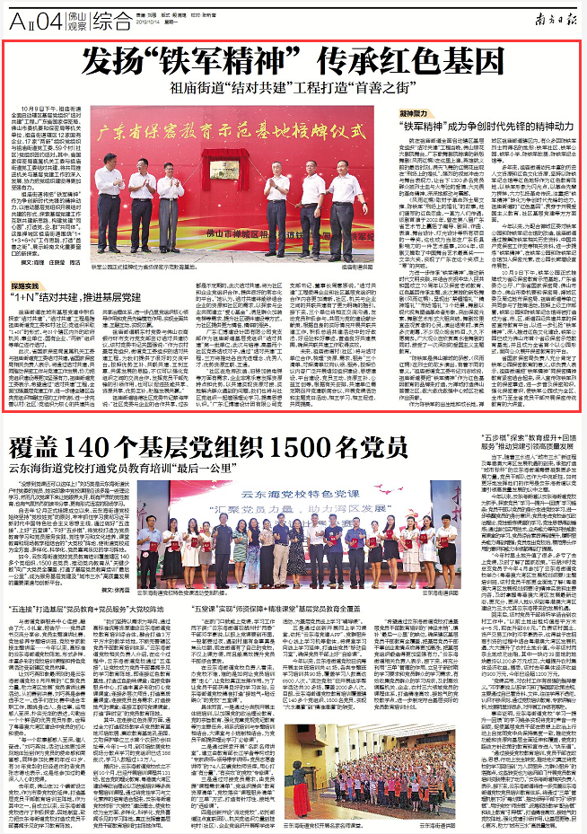 祖庙街道将把“铁军精神”作为争创新时代先锋的精神动力,以推动基层党组织开展结对共建的形式,探索基层党建工作互联共建新思路,构建党建“同心圆”,打造党、企、群“共同体”。这是禅城区祖庙街道围绕“1+1+3+6+N”工作思路,打造“首善之街”、展示岭南文化重要窗口的新探索。