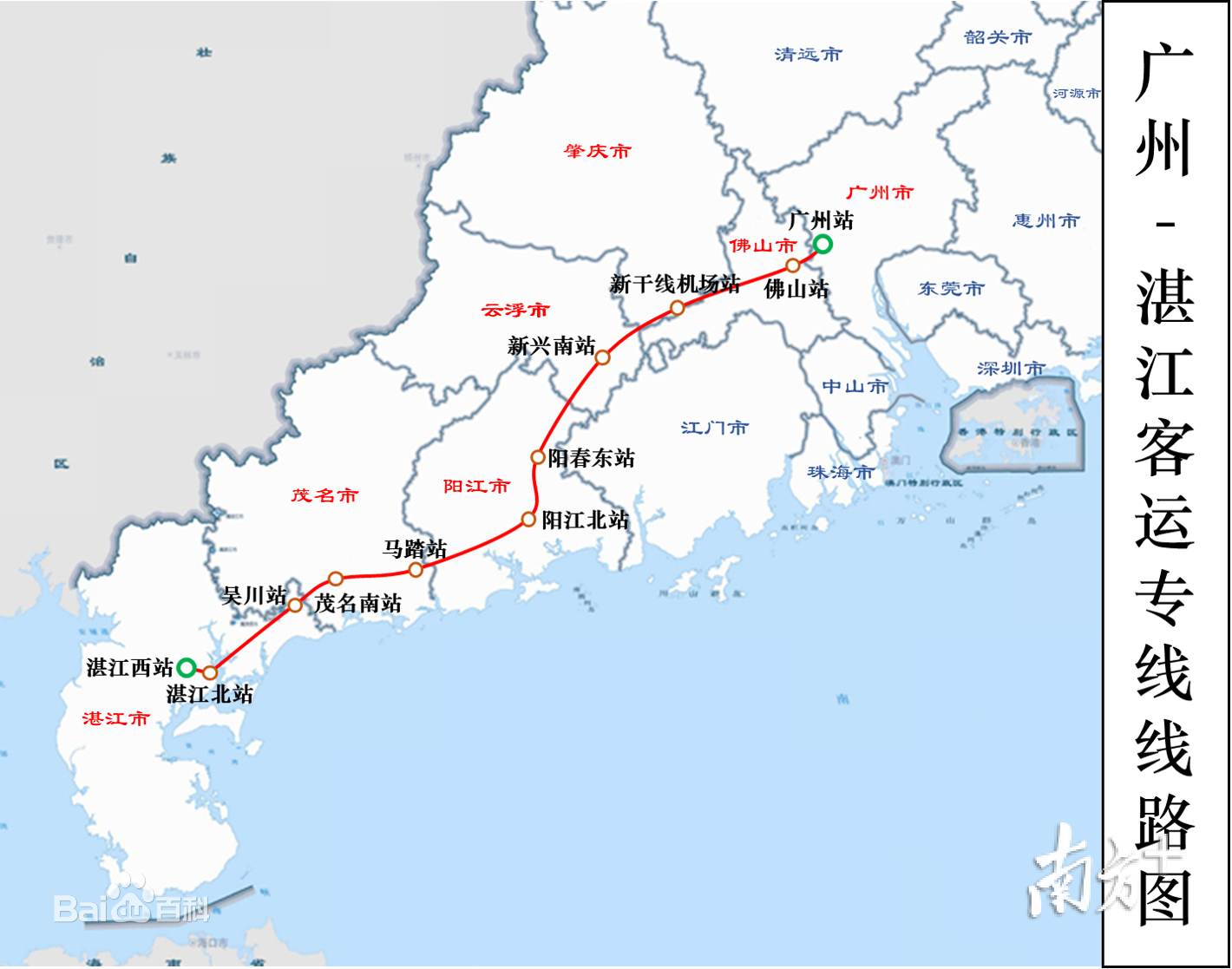 广湛高铁始发站位于广州火车站,途经佛山、肇庆、云浮、阳江、茂名、湛江等6市,终点站位于湛江北站,共设10个车站。