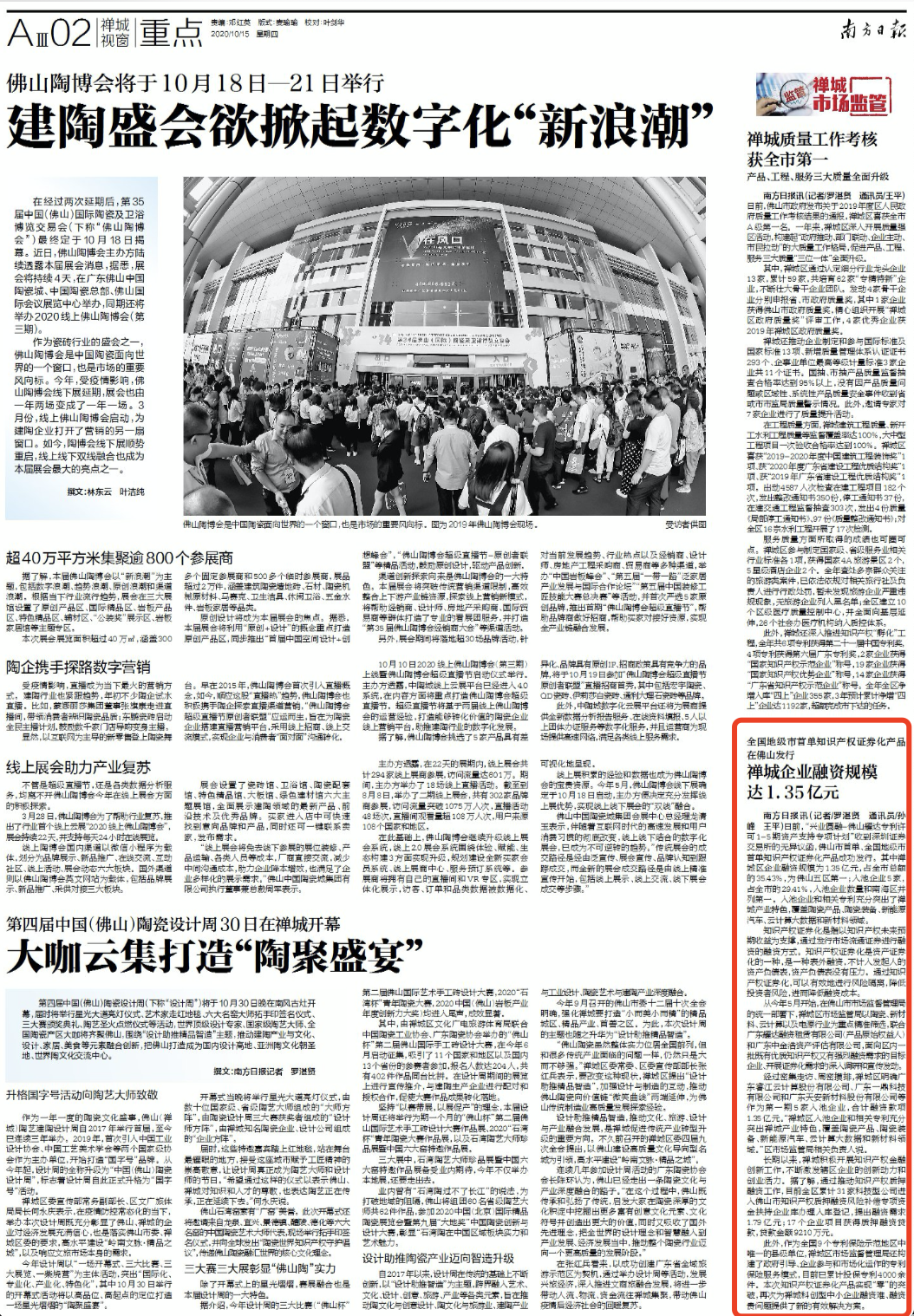 日前,“兴业圆融-佛山耀达专利许可1-5期资产支持专项计划”收到深圳证券交易所的无异议函,佛山市首单、全国地级市首单知识产权证券化产品成功发行。其中禅城区企业融资规模为1.35亿元,占全市总额的35.43%,为佛山五区第一;入池企业5家,占全市的29.41%,入池企业数量和南海区并列第一。入池企业和相关专利充分突出了禅城产业特色,覆盖陶瓷产品、陶瓷装备、新能源汽车、云计算大数据和新材料领域。