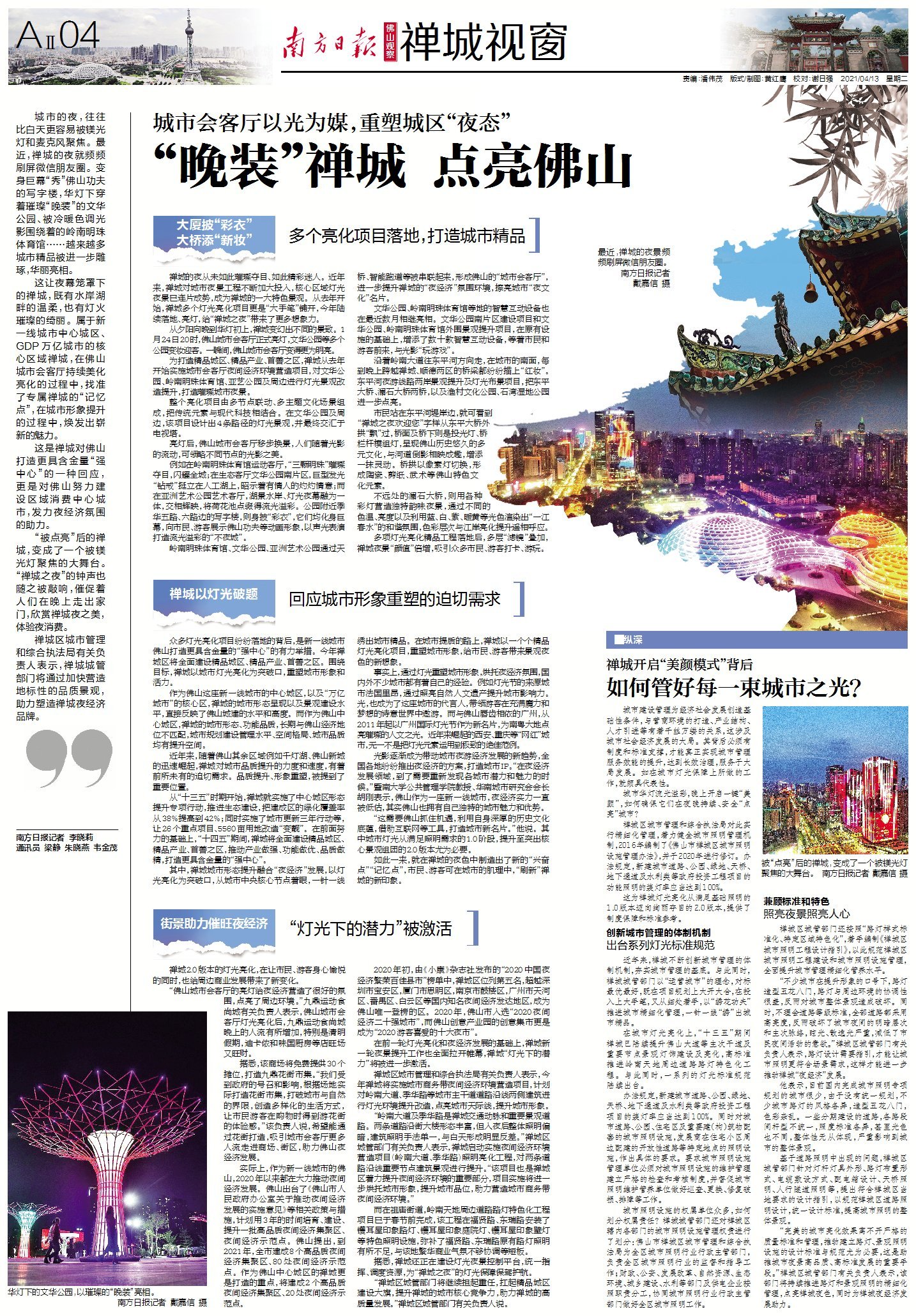 “完美的城市亮化效果离不开严格的质量标准和管理,推动建立路灯、景观照明设施的设计标准与规范尤为必要,这是助推城市夜景高品质、高标准发展的重要手段。”禅城区城管部门有关负责人表示,该部门将持续推进路灯和景观照明的精细化管理,点亮禅城夜色,同时为禅城夜经济发展助力。