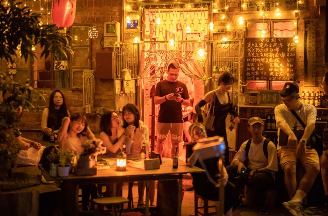 后来,发哥将小酒馆加入了暗室当中,欢迎每一位从四面八方而来的朋友,坐下来,小酌一杯。还会在社区空地,免费播放露天电影,老街坊和年轻人围坐在一起,谈天说地。