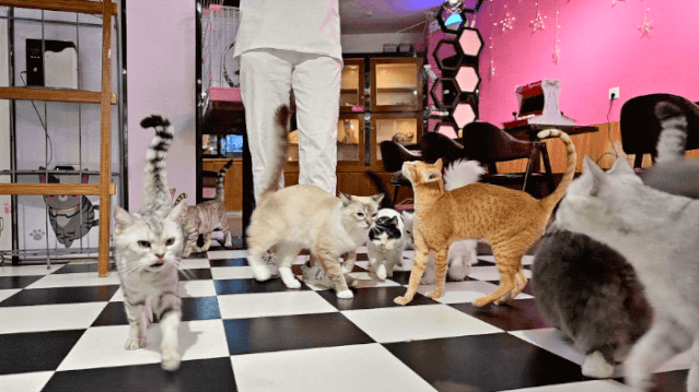 一进店就能看到各种猫咪,英短、豹猫、布偶、美短、加菲……只要你手里拿着零食,一群可爱的小馋猫迫不及待地围绕在你身边。