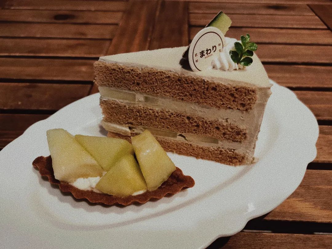 南山园焙茶栗子洋梨蛋糕,蛋糕体微苦带有茶香,中间层的是奶油混合着片状洋梨,口感丰富,层次感十足,表面放着超大颗的栗子上还放着少许金箔。