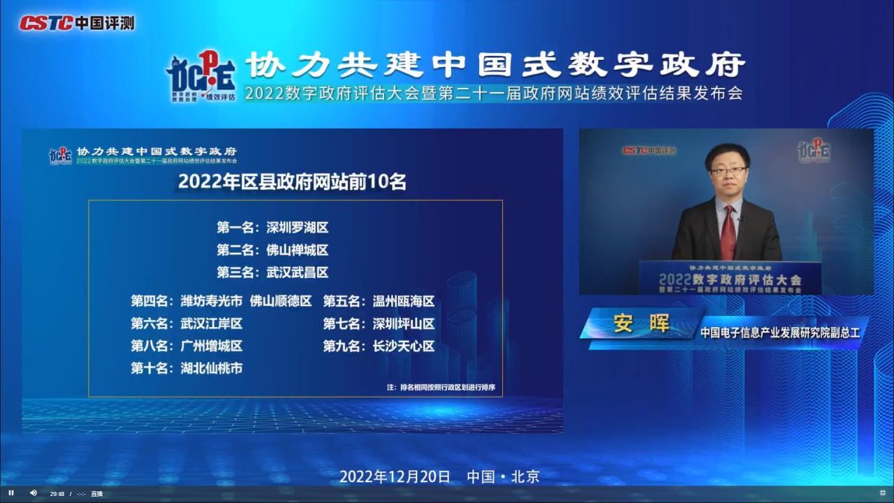 12月20日,由中国软件评测中心主办的“2022数字政府评估大会暨第二十一届政府网站绩效评估结果发布会”在北京召开。会上公布第二十一届中国政府网站绩效评估结果,禅城区政府门户网站在489家区县级参评单位中脱颖而出,在中国政府网站绩效评估中位列区县级第二名,这也是禅城区连续第6年蝉联第二名。