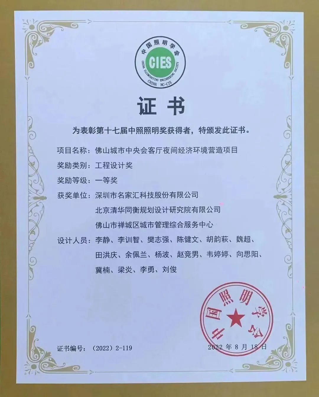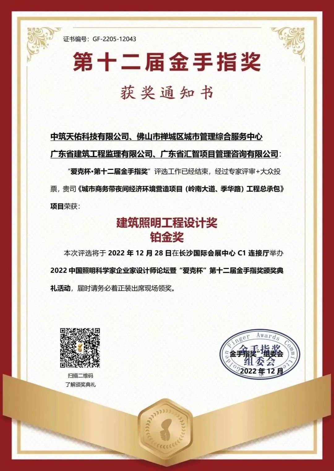 同时城市商务带夜间经济环境营造项目(岭南大道、季华路)也荣获中国照明行业综合性大奖“金手指奖”“建筑照明工程设计奖铂金奖(二等奖)”。