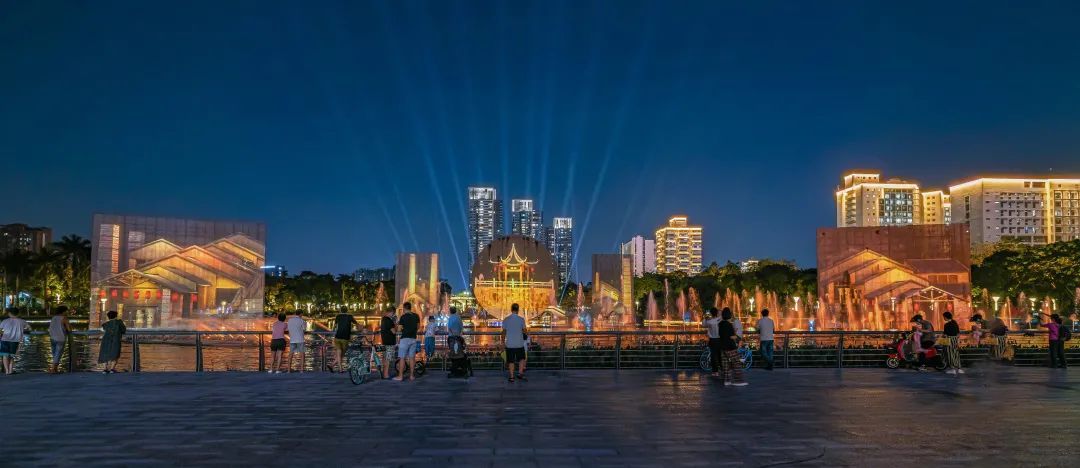 水舞声光秀是禅城闻名遐迩的城市标志,它以七个大屏和水幕投影为播放媒介,通过现代科技融合水、火、声、光、电等元素进行艺术化演绎。