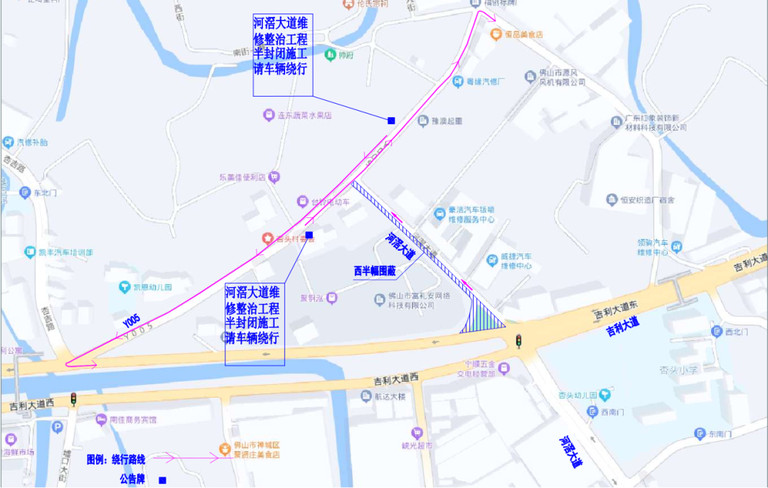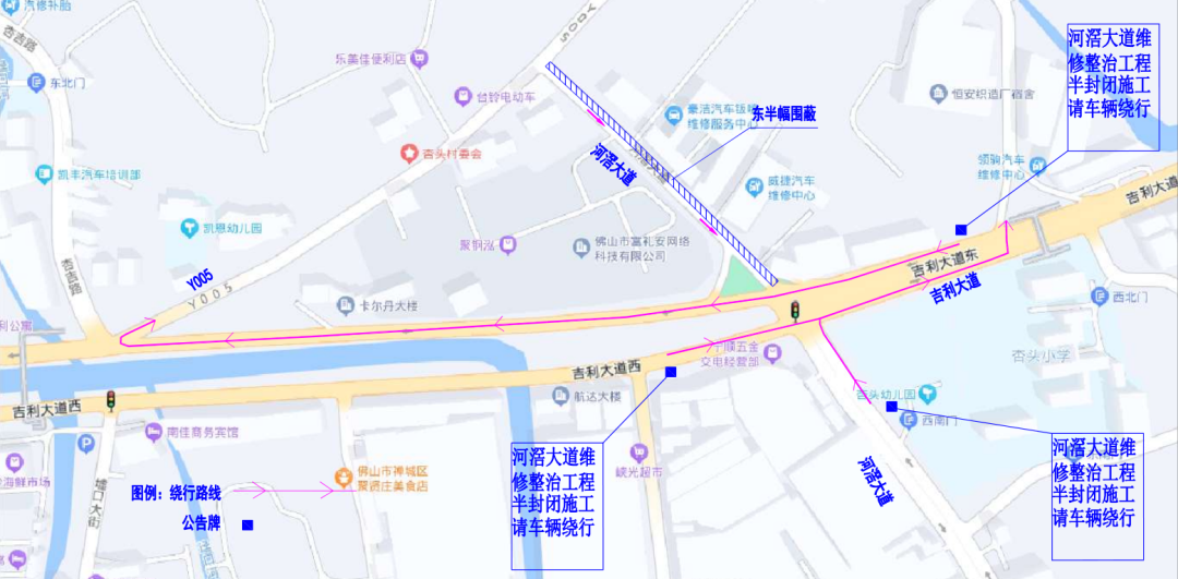 根据禅城区河滘大道维修工程施工需要,自2023年2月15日9时起,拟对河滘大道(樵乐路至贺丰大道)进行施工围蔽,对现状损坏的水泥路面破除修复、加铺沥青罩面,并完善路面标志标线,现场对交通组织进行调整,具体调整情况如下: