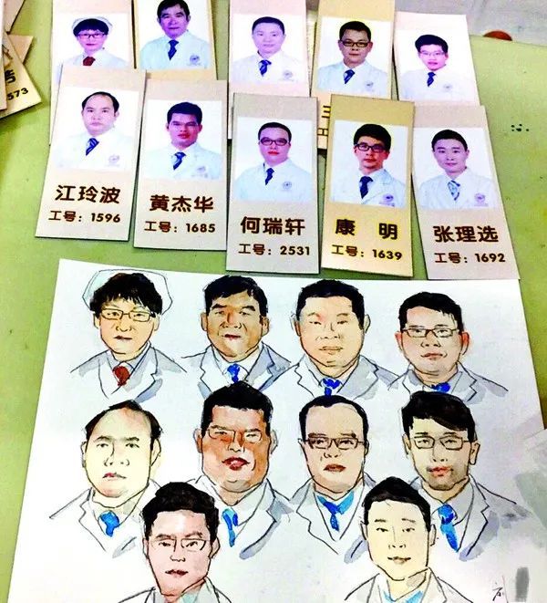 很快,一幅以康明医生为原型的水彩版“工作照”出炉了,惟妙惟肖的作品让大家直呼惊艳。见大家喜欢,刘先生便在病床上用了一个下午的时间,为骨科一区的医生、护士们画了一幅“全家福”。大伙儿接过这份礼物都惊喜不已,认为既别出心裁又有意义。