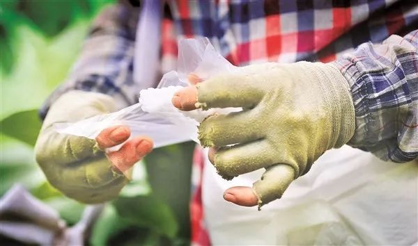 一个泡沫网,一个塑料袋,短短10秒,李兰聪给3个番石榴幼果分别套好了双层袋子。而普通人,10秒钟一般只能套好一个番石榴幼果。凭着这门技术,李兰聪成为职业水果套袋人,也称职业包果人。