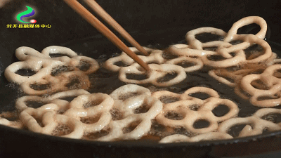 经过油炸后的糖环呈金黄色,入口香、甜、脆,同样是老少咸宜的年味食品。