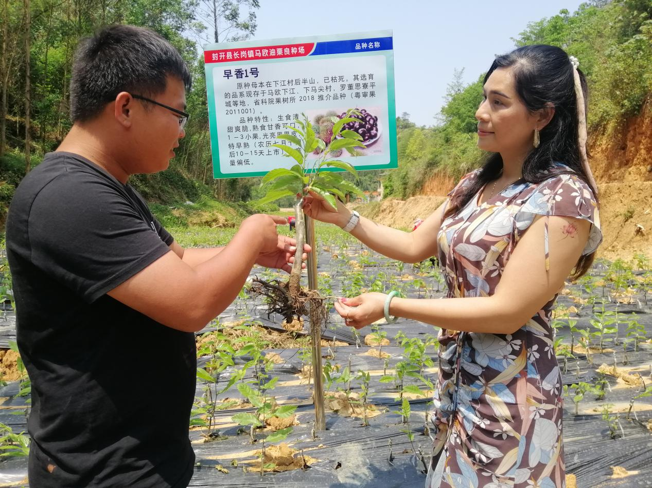 封开县长岗镇马欧村委会下江村自然村、大学生返乡创业陈东銮(左)在苗圃场向客户介绍封开油栗苗生长情况。黄瑛居 摄