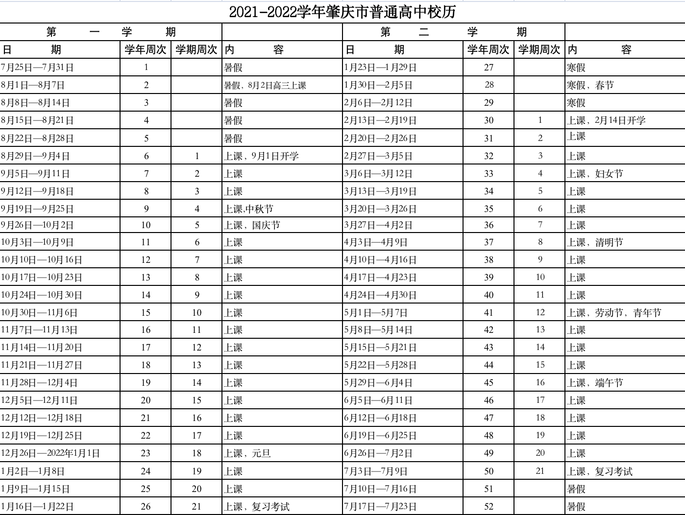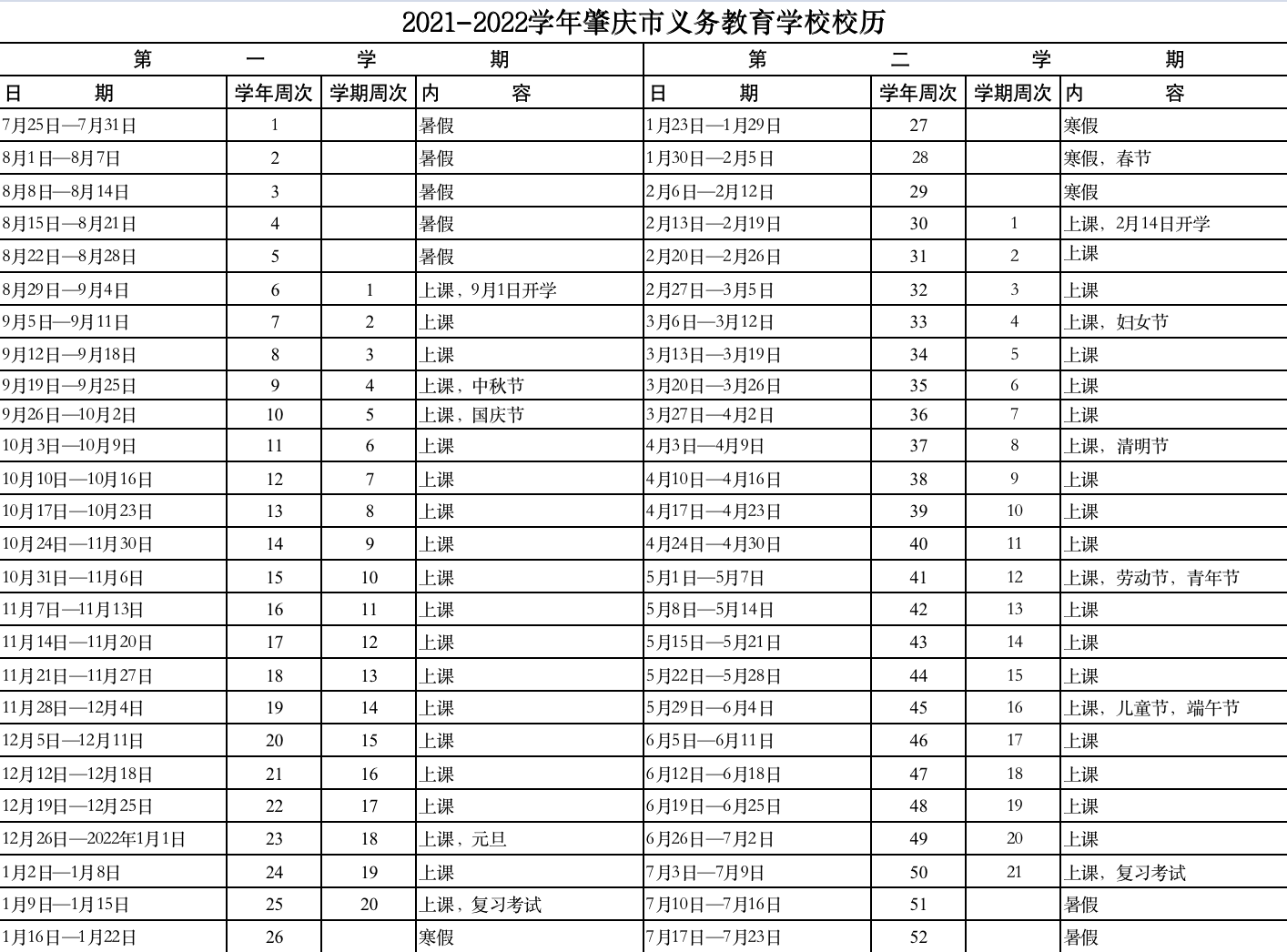 根据《2021-2022学年肇庆市义务教育学校校历》《2021-2022学年肇庆市普通高中校历》,今年肇庆暑假放假时间如下: