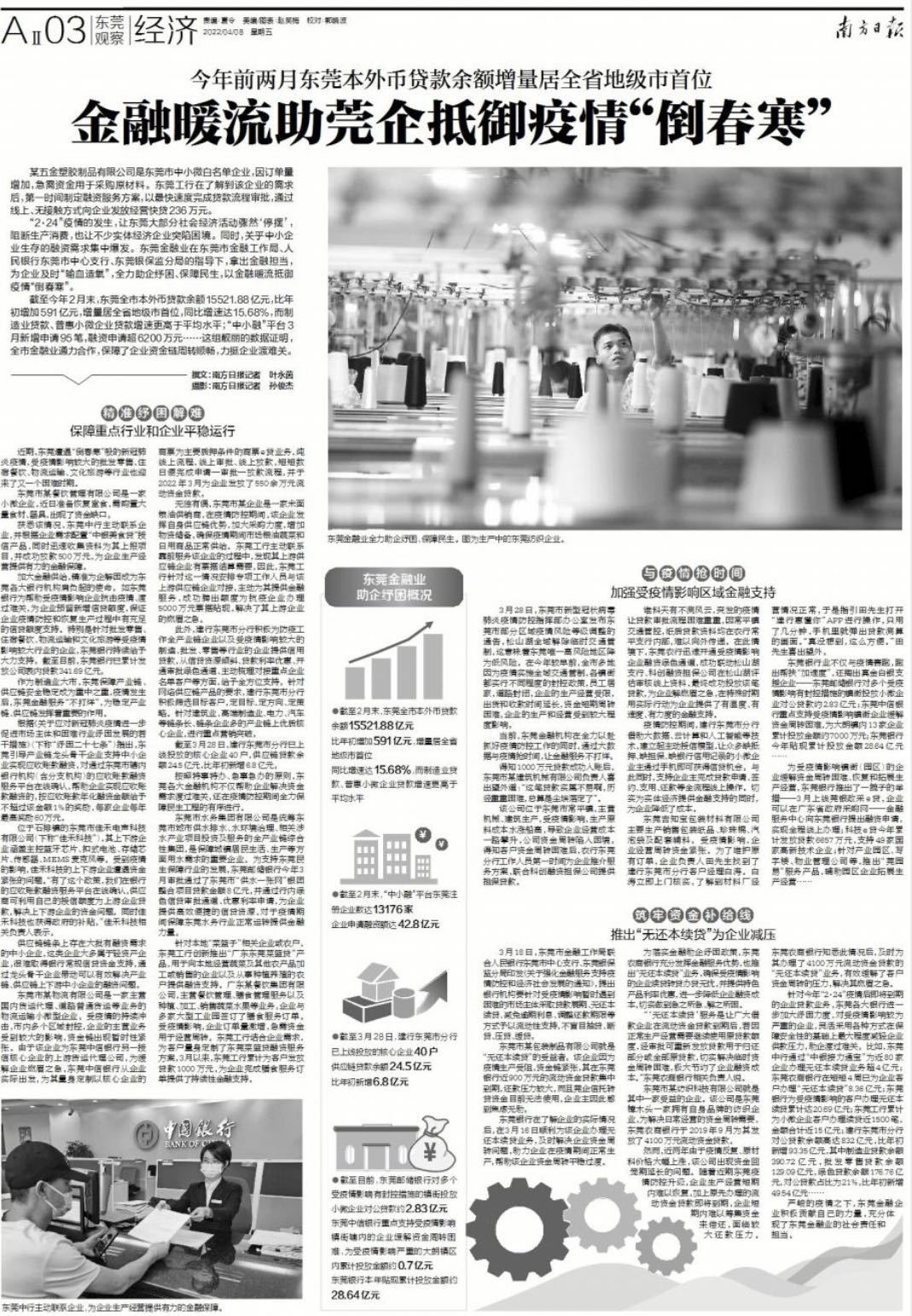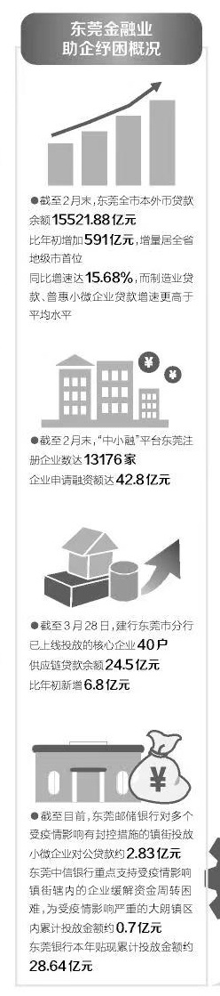 截至今年2月末,东莞全市本外币贷款余额15521.88亿元,比年初增加591亿元,增量居全省地级市首位,同比增速达15.68%,而制造业贷款、普惠小微企业贷款增速更高于平均水平;“中小融”平台3月新增申请95笔,融资申请超6200万元……这组数据证明,全市金融业通力合作,保障了企业资金链周转顺畅,力挺企业渡难关。