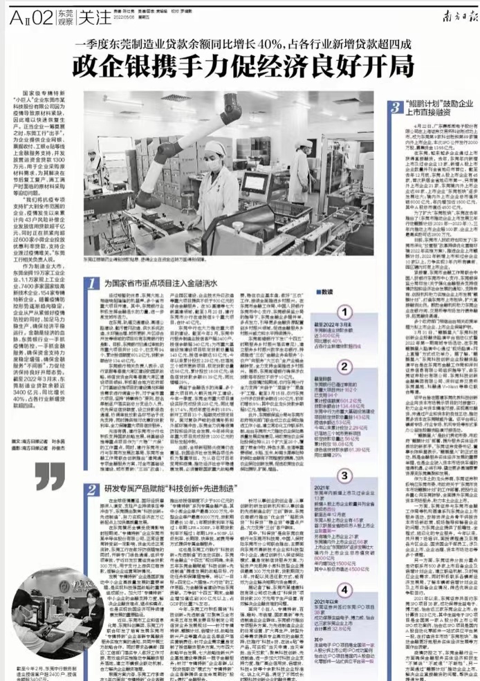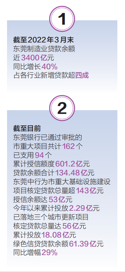 作为制造业大市,东莞坐拥19万家工业企业、1.1万家规上工业企业、7400多家国家级高新技术企业,154家专精特新企业。随着疫情防控形势逐渐趋向稳定,企业从严从紧做好疫情防控的同时,加足马力稳生产,确保经济平稳运行。金融是经济的血脉,东莞银行业一手抓疫情防控,一手抓金融服务,确保资金支持力度稳定增强,确保金融服务“不间断”,力促经济保持良好开局态势。截至2022年3月末,东莞制造业贷款余额近3400亿元,同比增长40%,占各行业新增贷款超四成。