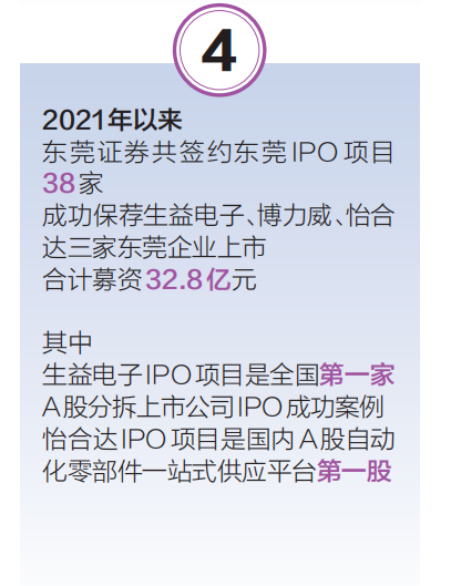 2021年以来,东莞证券共签约东莞IPO项目38家,成功保荐生益电子、博力威、怡合达三家东莞企业上市,合计募资32.8亿元,其中生益电子IPO项目是全国第一家A股分拆上市公司IPO成功案例、怡合达IPO项目是国内A股自动化零部件一站式供应平台第一股,在打造资本市场“东莞板块”、推动金融更好地服务实体经济发展等方面作出贡献。