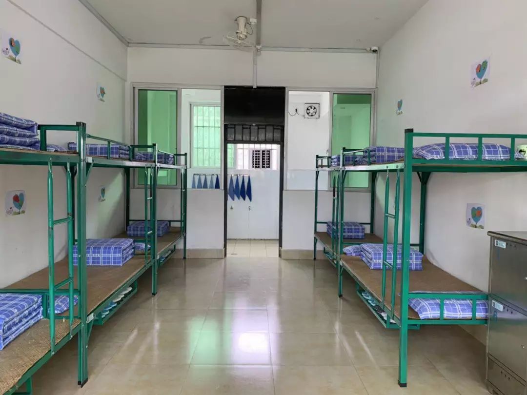 走进女子强戒所的宿舍区,记者看到戒毒人员住的是10人一间的集体宿舍,分上下铺硬板床,一人一个铺位,每人都配有一个带锁的铁箱可放置物品,毛巾、牙刷、水杯等洗漱用品则统一整齐地放置在宿舍的一角,每间宿舍都配有一台液晶电视机用于每晚观看新闻联播。