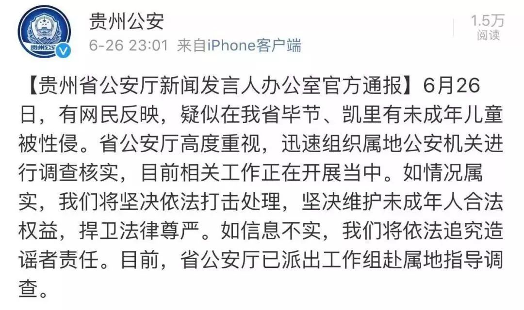 贵州省公安厅副厅长吴智贤称,属地公安机关已经全面介入,正在积极核实信息的真伪,调查组目前已经开展工作。如果性侵消息是真实的,将从严打击。如果是造谣,也会依法打击。