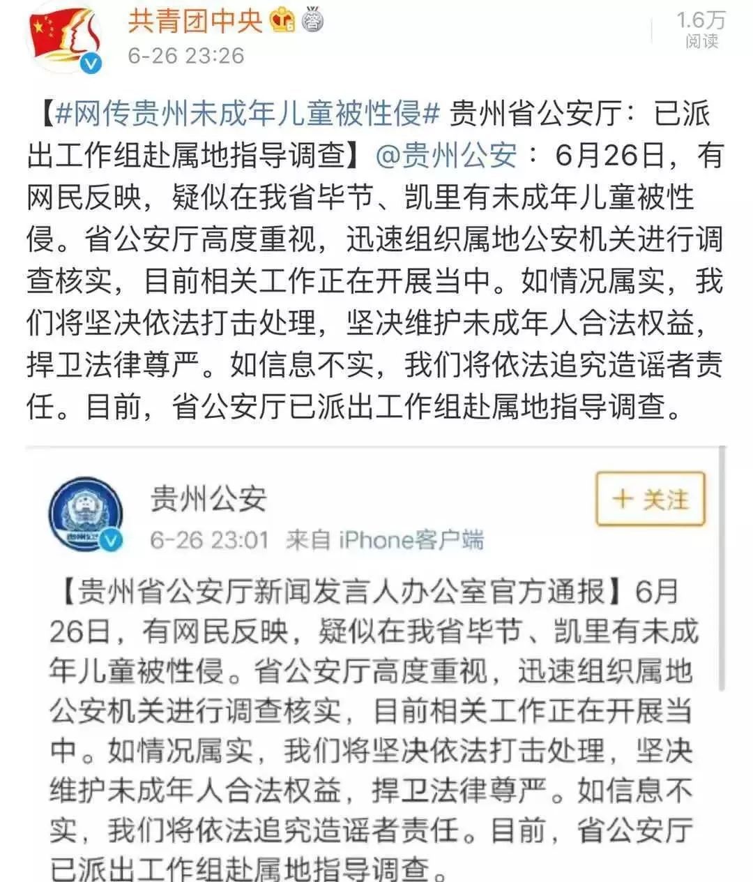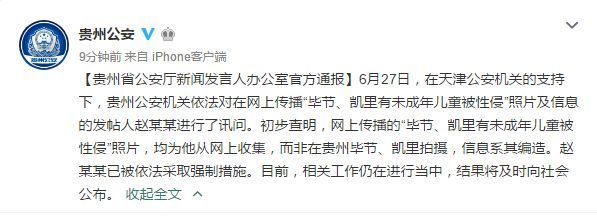 据贵州公安消息,6月27日,在天津公安机关的支持下,贵州公安机关依法对在网上传播“毕节、凯里有未成年儿童被性侵”照片及信息的发帖人赵某某进行了讯问。