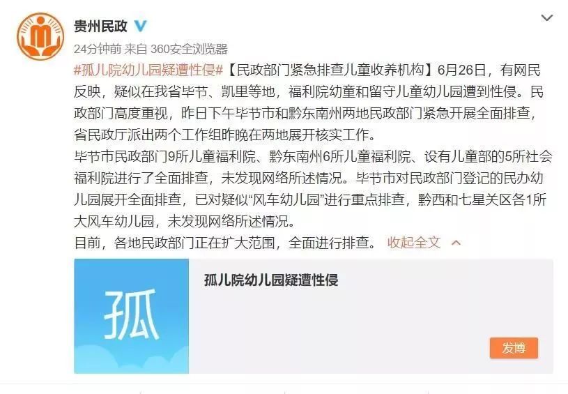 贵州省民政厅今天上午发布消息称,毕节市民政部门9所儿童福利院、黔东南州6所儿童福利院、设有儿童部的5所社会福利院进行了全面排查,未发现网络所述情况。毕节市对民政部门登记的民办幼儿园展开全面排查,已对疑似“风车幼儿园”进行重点排查,黔西和七星关区各1所大风车幼儿园,未发现网络所述情况。