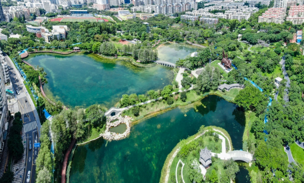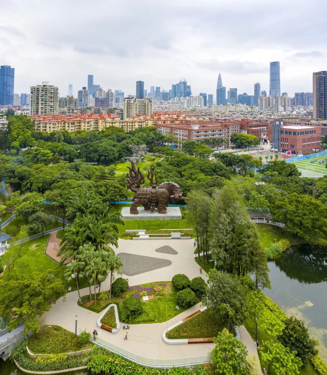 四海公园历经三十多年,承载了那个年代无数拓荒牛、来深建设者独一无二的成长记忆。修葺一新的盖世金牛、新铺设的蓝色环湖跑道、荔枝林下的休憩平台、别致的花漾水岸……2020年“十一”国庆,经过提升改造后,四海公园焕彩归来。2.0版本的四海公园,设置了荔香园、叠水桥、杜鹃园、童乐园、四海书吧、梯田叠水等30多处特色景观。
