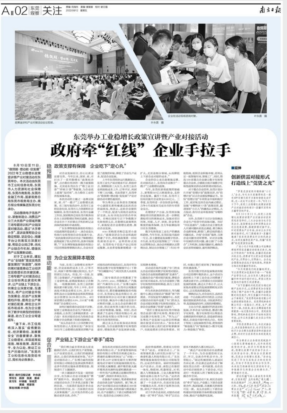 8月10日至11日,“稳预期·增动能·促发展”2022年工业稳增长政策宣讲暨产业对接活动在东莞举办。本次活动由东莞市工业和信息化局、东莞市人力资源和社会保障局、东莞市商务局、东莞市金融工作局、国家税务总局东莞市税务局主办,南方报业传媒集团东莞分社承办。