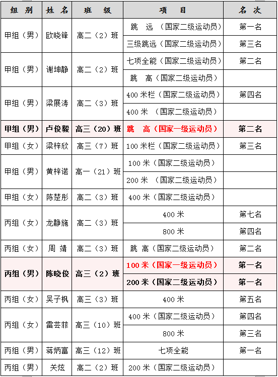 其中中山一中卢俊毅同学和陈晓俊同学分别在跳高以及100米赛事中以优异成绩获“国家一级运动员”申报资格(本届赛事中获此成绩的,中山市仅2人);欧晓锋等14人次获“国家二级运动员”申报资格;曾恒谋、刘鹏飞、庞宇婷教练获评“广东省优秀教练”。