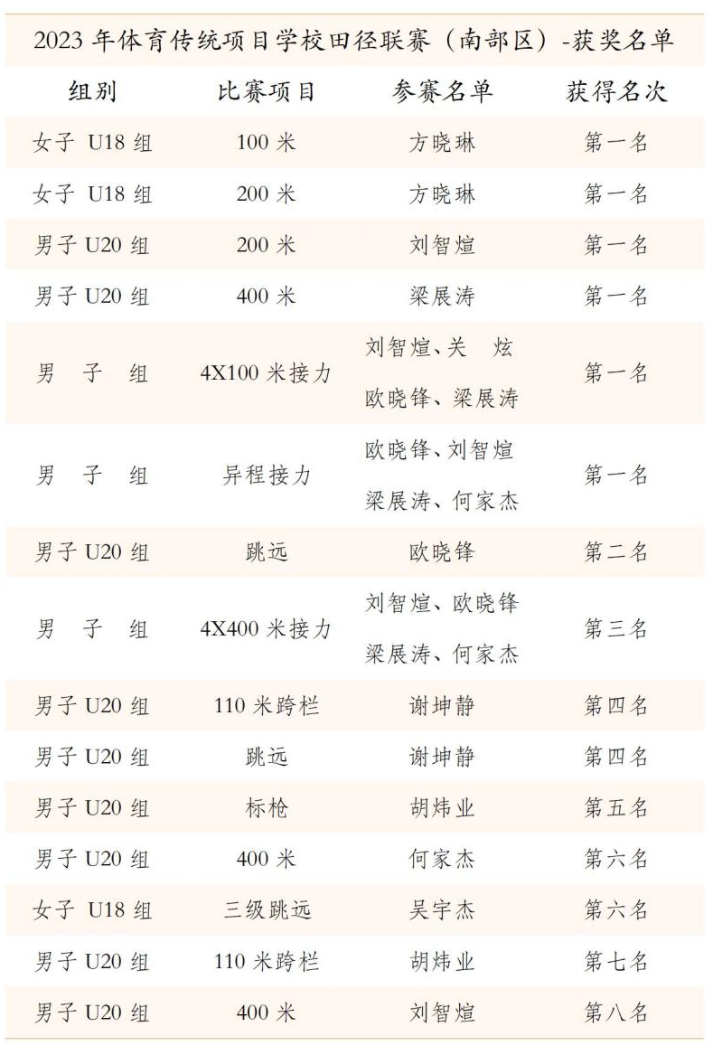 日前,2023年体育传统项目学校田径联赛(南部赛区)在湖北黄石圆满落幕。本次比赛为期3天,设有U16、U18、U20三个组别,共有来自福建、江西、湖南、广东、广西、湖北、海南等地107支队伍、1000余名青少年参赛。比赛设男女100米、200米、400米、800米、1500米、3000米、400米栏、跳高、跳远、三级跳远、铅球、铁饼、标枪、链球、男子110米栏、女子100米栏等多个项目,为南部区体育传统项目学校的青少年们提供了同台竞技和展示交流的平台。此次比赛中,我校田径队共派出12名运动员参赛,斩获六枚金牌,并收获男子团体总分第三名的好成绩。