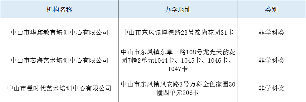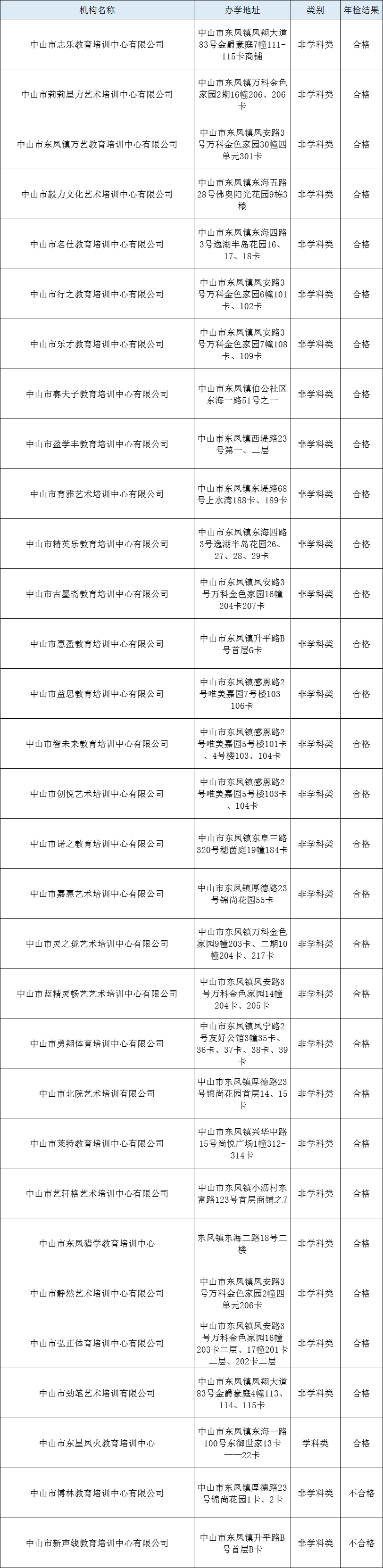 经审查,2022年中山市东凤镇校外教育培训机构年检结果公示如下,请学生家长理性选择合规机构,如遇问题线索可直接向东凤镇教体文旅局反馈。