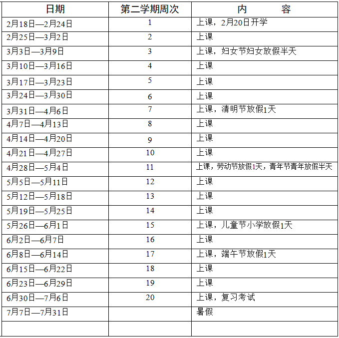 说明:1.全学年52周,在校时间40周(其中教学时间39周:上课时间35周、机动2周、复习考试2周,节假日累计约1周),寒暑假约12周;