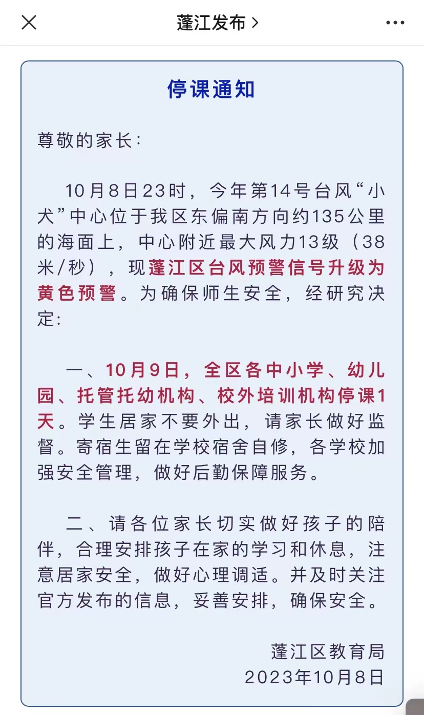 记者从蓬江区教育局获悉,由于受台风“小犬”和冷空气共同影响,预计9日蓬江区有较大风力和降雨,为确保师生安全,经研究决定全区各中小学、幼儿园、托管托幼机构、校外培训机构10月9日停课1天,后续复课通知待气象部门和蓬江区三防指挥部发布通知再作决定。