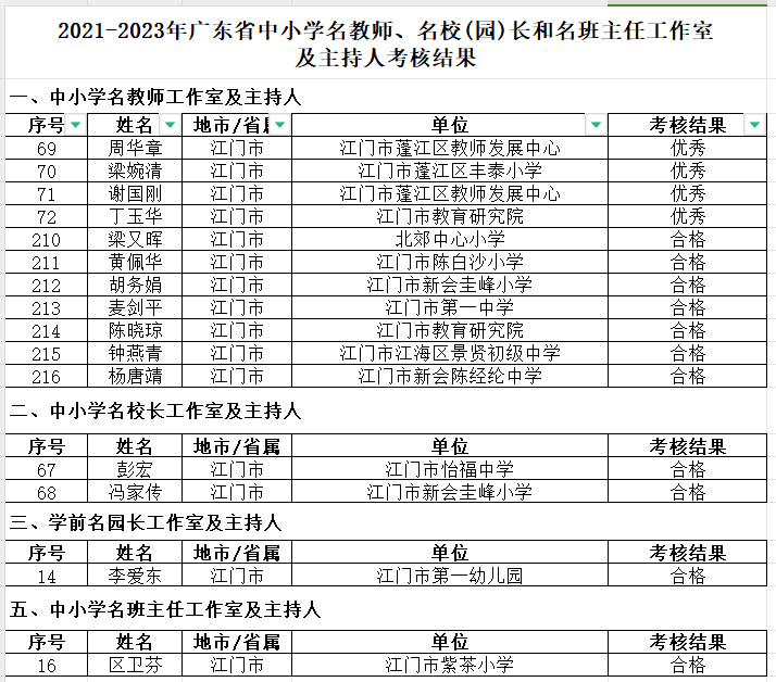 日前,广东省教育厅公布2021—2023年中小学名教师、名校(园)长和名班主任工作室及主持人考核结果,江门市共有4个工作室及主持人的考核结果为优秀,11个工作室及主持人的考核结果为合格(如下图)。